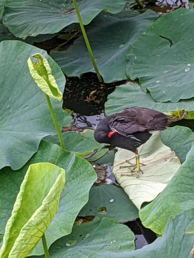 鴨の幼鳥が蓮の葉に乗っかって毛ずくろい(^^♪
